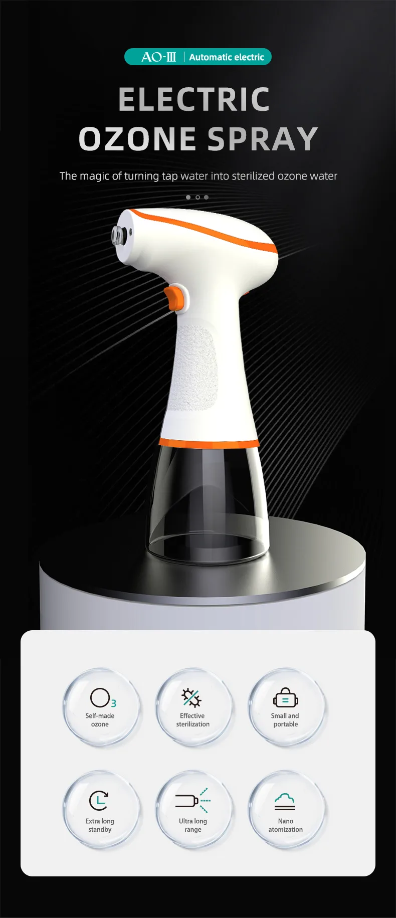 It generates ozone water anytime and anywhere. In USA and some developed European countries "ozone water" is called "universal water". Its germicidal speed is many times faster than chlorine and alcohol, and its germicidal rate reaches 99.9%. It is colorless with no stimulating smell, mild and not irritating, therefore it is safe for use.