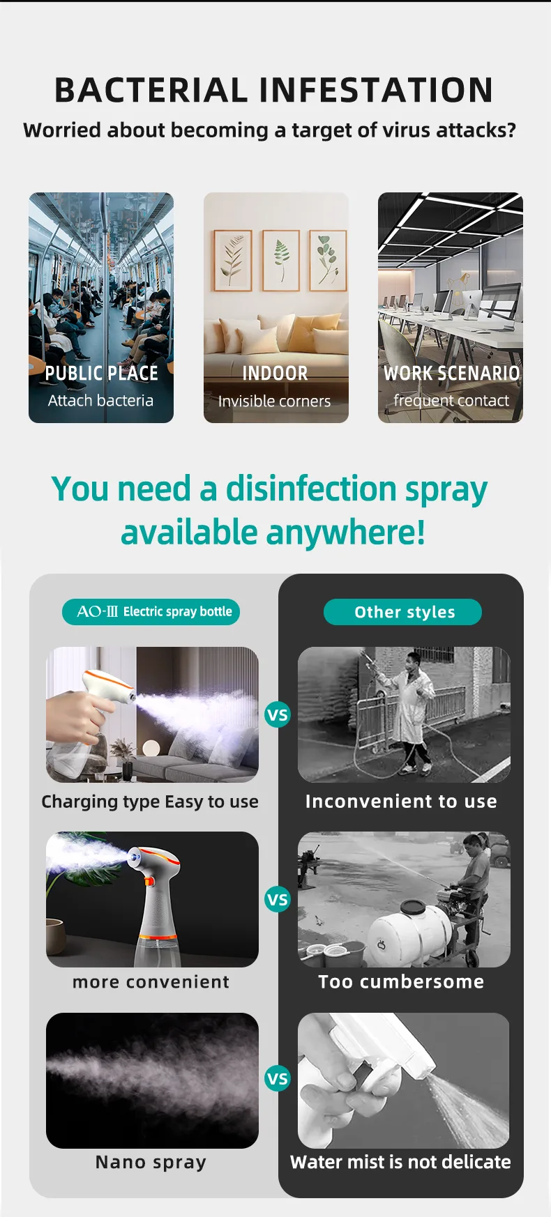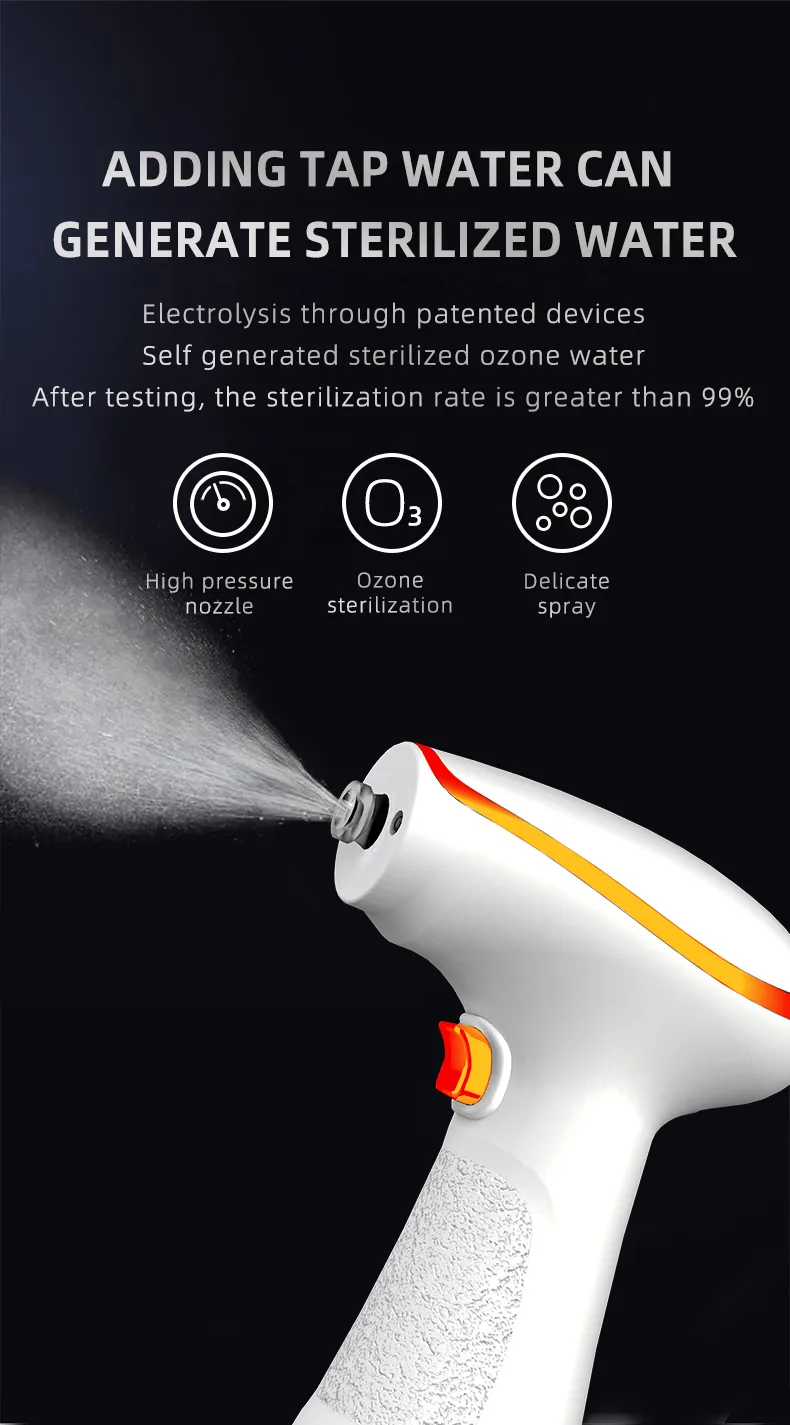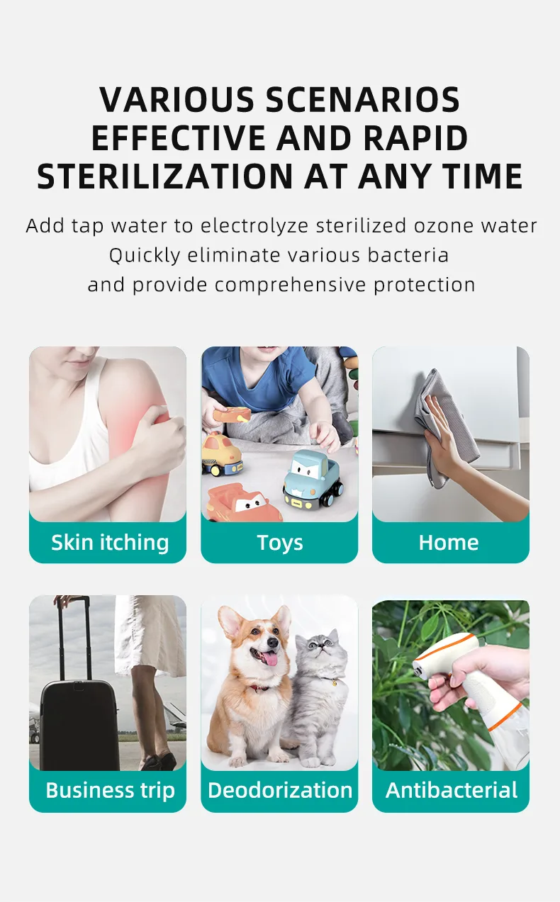 As ozone water generated by the sprayer is not only highly effective in sterilization, but also colorless without stimulating smell, it is safe, non-toxic, mild and not irritating. It can be used on pregnant women and infants.